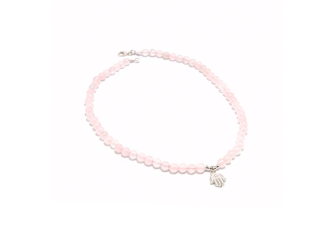Collar de piedras cuarzo rosado y mano de Fátima de plata