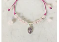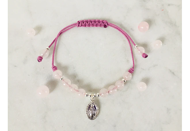 Pulsera de hilo regulable con piedras cuarzo rosado y medallita de la virgen de los rayos